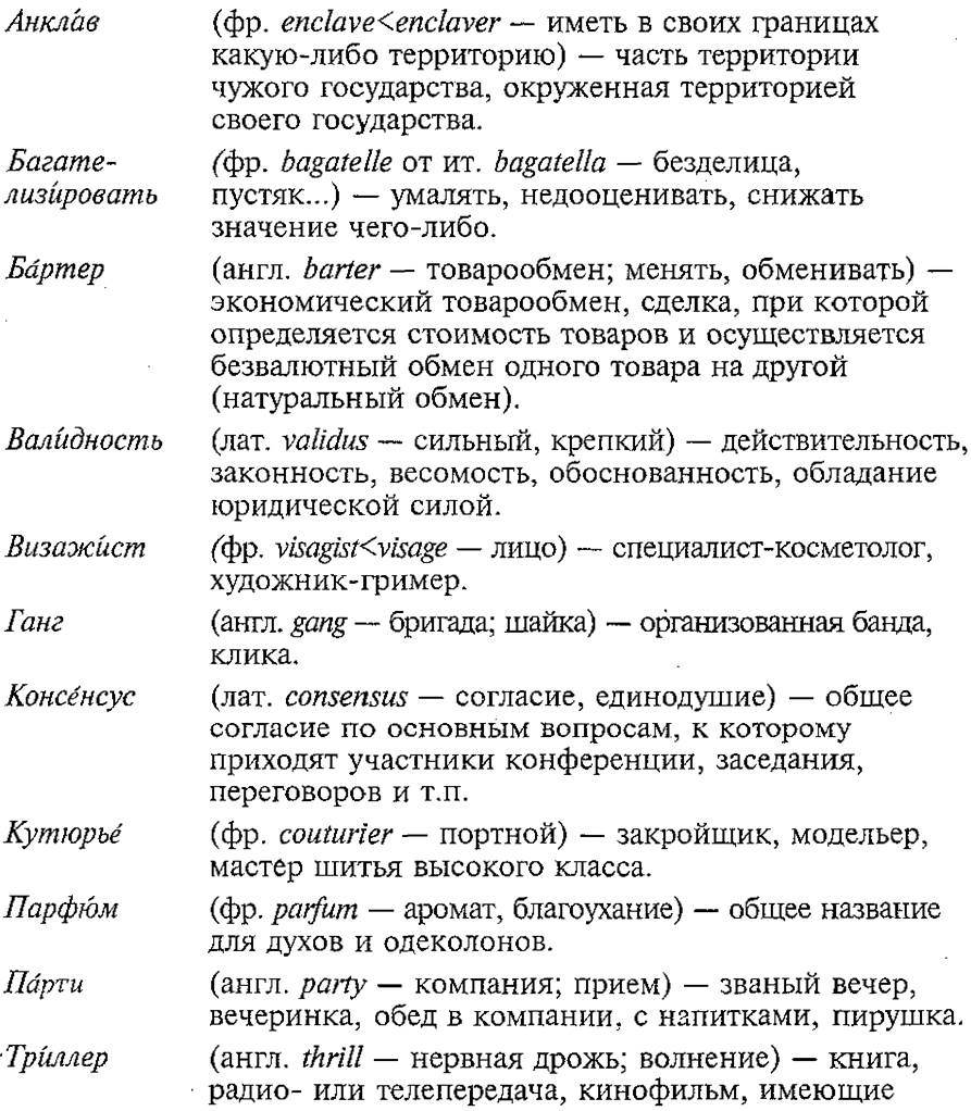 Гран-при (высшая награда на фестивале, конкурсе), грант (денежное пособие, выдаваемое специальными фондами и предназначенное для материального обеспечения научных исследований), йети (снежный человек), киллер (наемный убийца), ноу- хау (новые передовые технологии производства), саммит (встреча на высшем уровне), эксклюзивный (исключительный), электорат (совокупность избирателей).