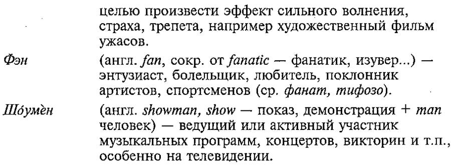 1. В понедельник состоится fashion-show (показ моделей) модельера Ярослава Куриленко под названием «Цветы Востока». 2. Движущей силой постановки «Маскарада» оказывается ледяной эстетизм, актеры здесь становятся фигурантами, имеющими скорее декоративные задачи. 3. Традиционные рождественские «sales» (распродажи) в салонах довольно редки. 4. Коммерческие отделы и иностранные бутики разукрашены елочными гирляндами и шариками. 5. Своей балетной харизмой Плисецкая осеняет тех, кому танцевать дальше. 6. Новый триллер создает в зрительном зале атмосферу саспенса (напряжения). 7. Важную роль в современном обществе играет создание опережающих технологий, ноу-хау. 8. Многие сейчас испытывают фьюче шок («шок будущего»). 9. Фильм В. Мотыля «И несут меня кони» не был закончен к началу феста (праздника). 10. Любовь и смерть переплетены в музыкально-детективной love-story «Эй, странник». 11. Какой смысл держать нас в течение восьми вечеров у голубых экранов в ожидании хеппи-энда?