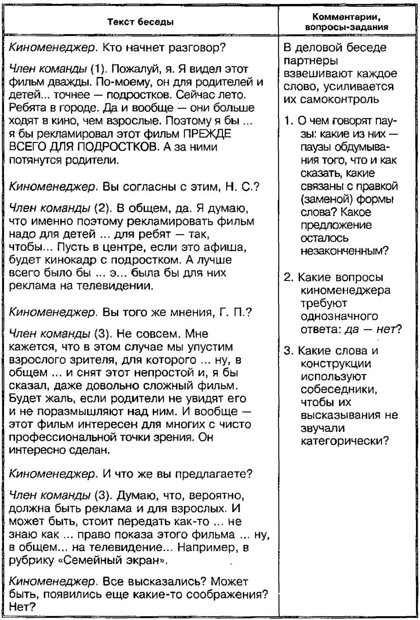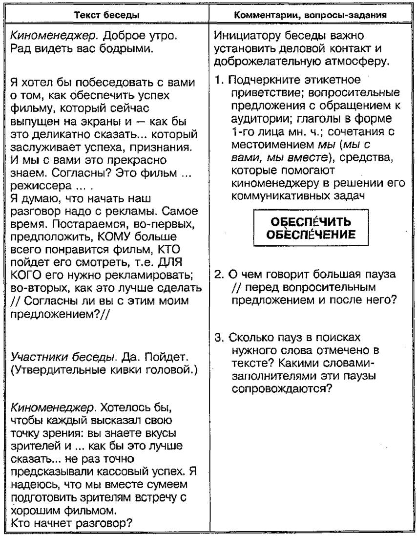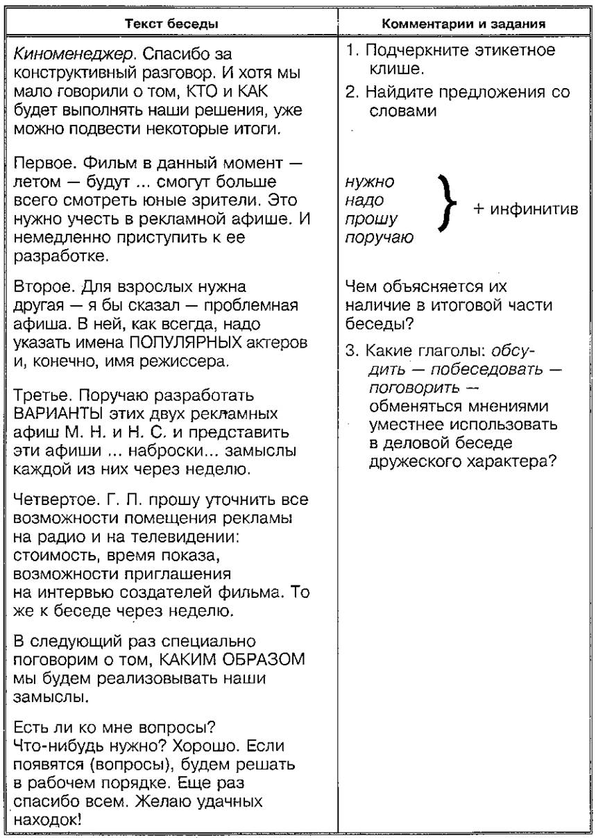 ① Проанализируйте части деловой беседы киноменеджера (прокатчика) со своей командой. Эти части — начало беседы; основная часть, заключение даны последовательно в трех задачах (I, II, III).