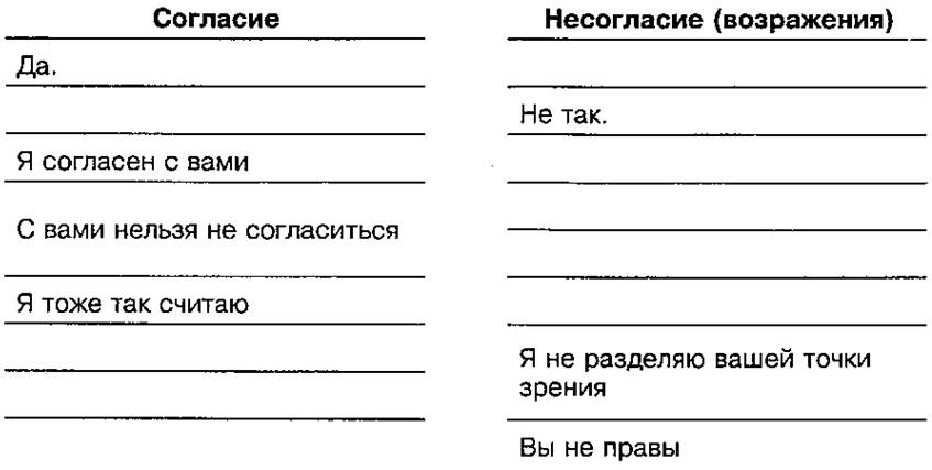 ③ М. В. Ломоносов выделял два типа разговоров: «согласные» и «прекословные», т. е. разговоры, в которых собеседники либо согласно, т. е. миролюбиво, беседуют, либо прекословят, противоречат, возражают друг другу. Д. С. Лихачев пишет: «Да и нет в нашем языке... Но как много синонимов мы можем подобрать к да (конечно, безусловно и т. д. и т. п.) и мало к нет. Соглашаемся всевозможными способами, а отвергаем немногими». Так ли это на самом деле? Подберите и запишите средства выражения согласия и несогласия.