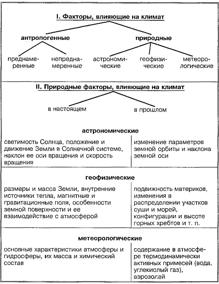 ⑤ Прочитайте текст «Факторы, влияющие на изменение климата» (см. задание 3 § 4.3.2). Сравните два приведенных конспекта, определите их тип, укажите различия междуэтими типами конспектов. Проанализируйте конспект, выделите смысловые части. Опираясь на конспект, перескажите текст. Какой тип конспекта помогает более легко развернуть текст?